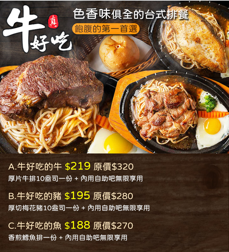招牌必點的厚切牛排,霸氣登場!嚴選肉質緊實的上好牛排,保有少許油脂,無添加多餘調味,掌握精準的火侯,香煎熟成,呈現最佳的熟度。趁熱入口,口感柔嫩多汁、鮮醇味美,齒頰間繚繞著迷人的肉香與淡淡的油脂香氣,不斷地促進食慾,配上濃郁可口的鐵板麵,吃起來又更對胃,大口吃肉的幸福就此實現!