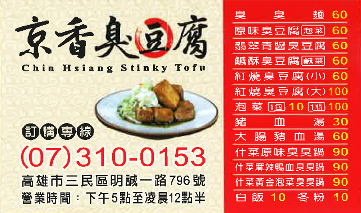 在台灣美食中位居前幾名的臭豆腐向來是眾人必點小吃之一,位於高雄市三民區明誠一路的〝京香臭豆腐〞,不同於市面傳統臭豆腐,京香研發了多種獨特口味的臭豆腐與臭臭鍋,創新口感挑戰美食饕客的味蕾,顛覆您對傳統臭豆腐的印象,歡迎您來嚐鮮一番!