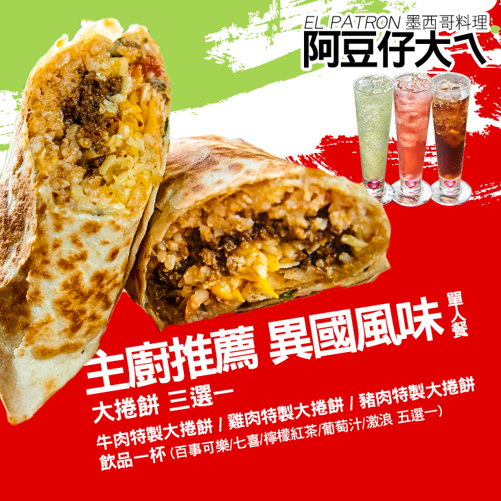 牛肉特製大捲餅/雞肉特製大捲餅/豬肉特製大捲餅 三選一 + 飲品一杯(百事可樂/七喜/檸檬紅茶/葡萄汁/激浪 五選一)