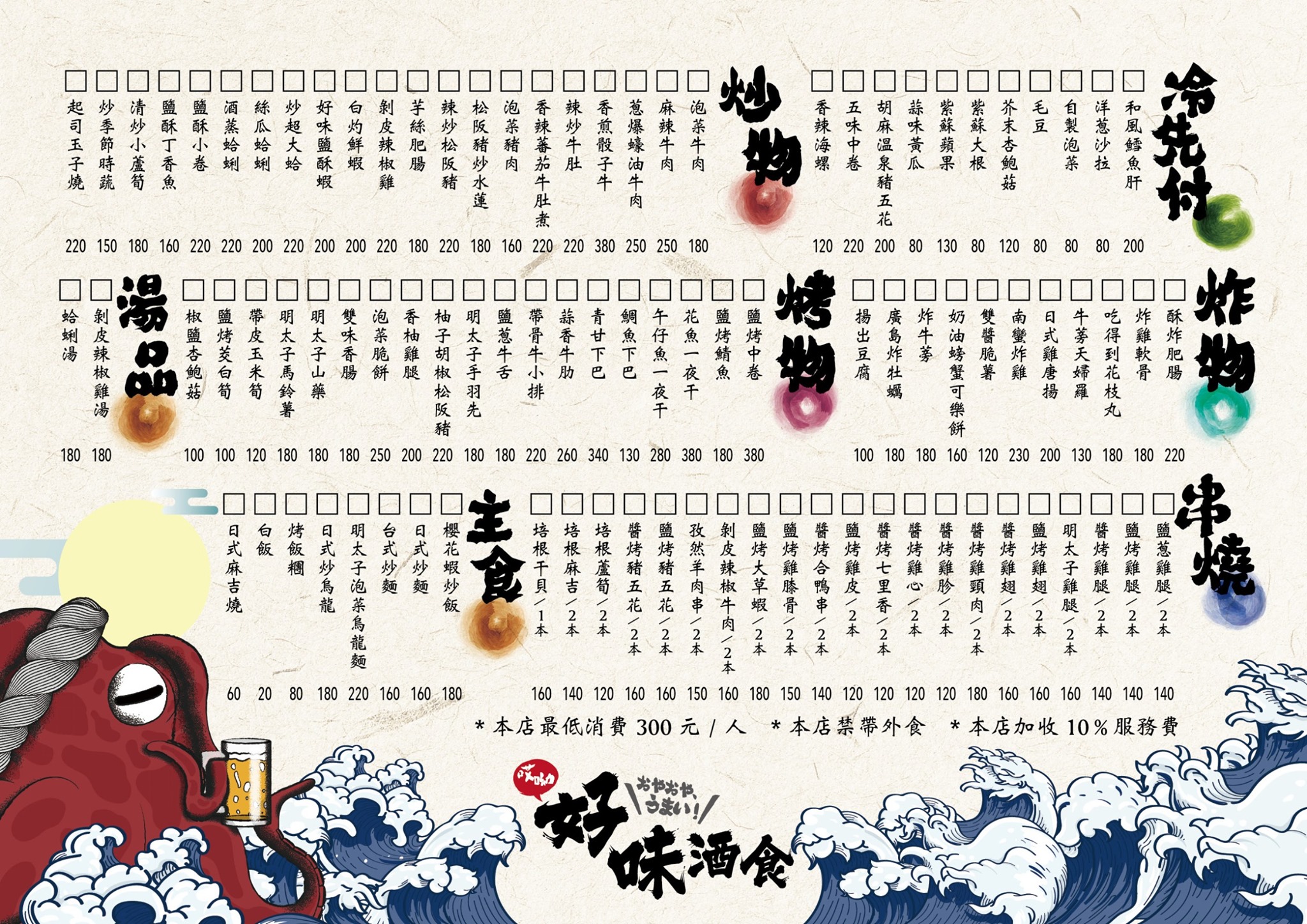 近捷運忠孝復興站4號出口!以日式創意特色料理聞名的【山葵大眾酒場】,黑色牆面刷漆穿插七彩手繪圖騰的裝潢設計,給人濃濃日式居酒屋的文化氣息!餐點主要提供以新鮮、創意、美味的日式料理為主,從生魚片、串燒到烤物,菜色豐富、選擇多元!另外更提供多款地到味美的日式酒品及店家精選特調,讓您與三五好友能在這寶貴的夜晚時光,因美酒佳餚,感情更加凝聚~無疑是您下班後想小酌一杯的最佳選擇!