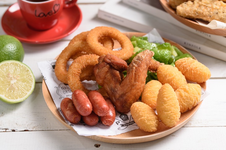 檸檬雞翅、洋蔥圈、熱狗串、青椒、豆豆薯球
