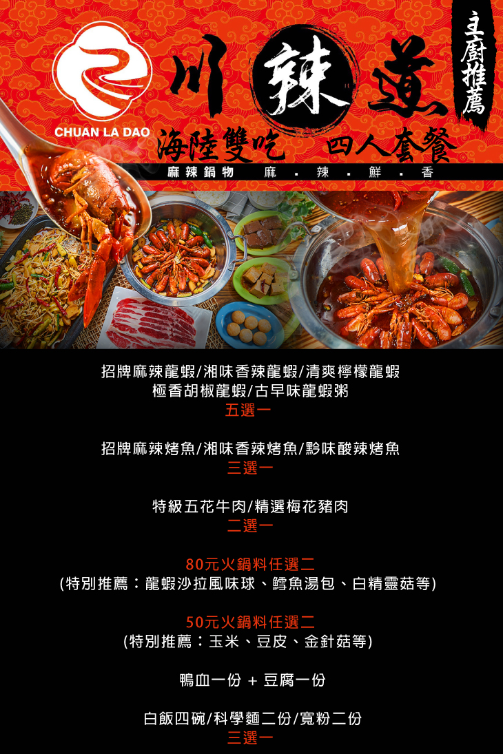 最夯、最火紅的麻辣小龍蝦強勢來襲!您,準備好接招了嗎?位於高雄市三民區文濱路55號上的【川辣道麻辣鍋物】,餐點販售以自家最著名的招牌麻辣龍蝦、麻辣烤魚及麻辣風味湯底,成功在三民區一帶打響名號。堅持選用最新鮮的食材、最嫻熟的手藝烹飪好每一道料理,讓顧客體會實實在在、正港尚青ㄟ佳餚美味,一刻不容馬虎的環節,只有細心品味才能感受!看到這裡,是不是也和我一樣已經等不及想驅車前往光臨品嚐了呢!二話不說,趕緊出發吧!