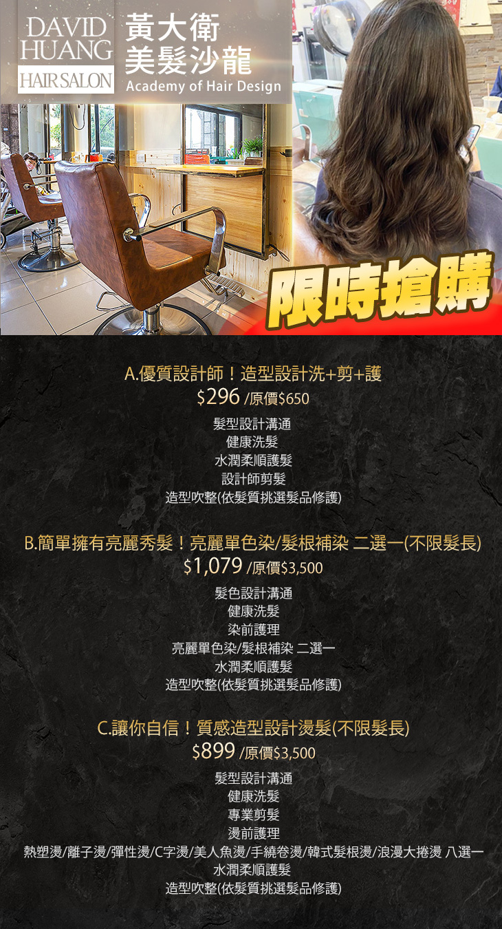 A.優質設計師!造型設計洗+剪+護 / B.簡單擁有亮麗秀髮!亮麗單色染/髮根補染 二選一(不限髮長) / C.讓你自信!質感造型設計燙髮(不限髮長)