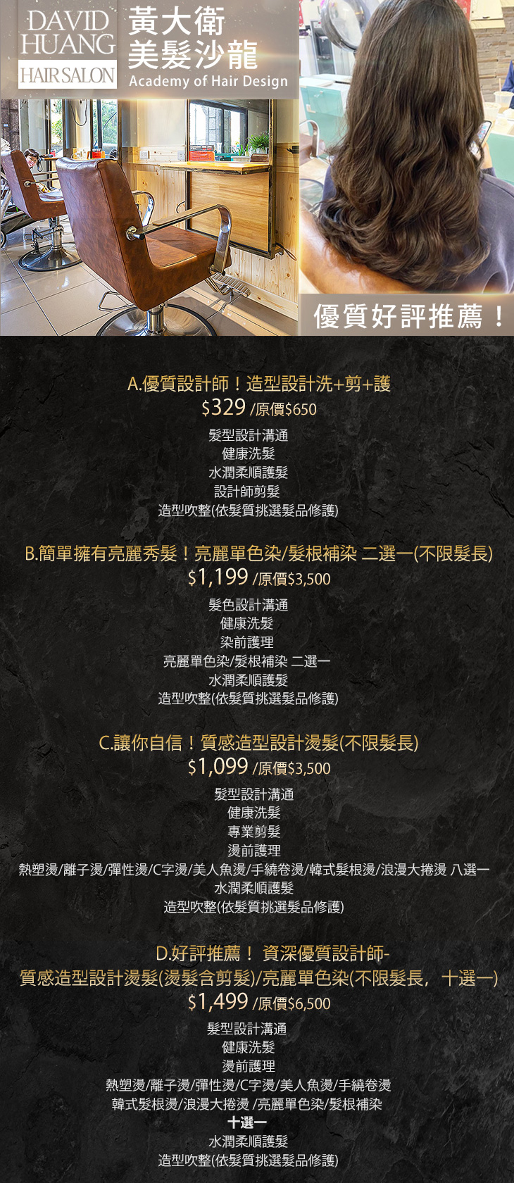 A.優質設計師!造型設計洗+剪+護 / B.簡單擁有亮麗秀髮!亮麗單色染/髮根補染 二選一(不限髮長) / C.讓你自信!質感造型設計燙髮(不限髮長) / D.好評推薦! 資深優質設計師-質感造型設計燙髮(燙髮含剪髮)/亮麗單色染(不限髮長,十選一)