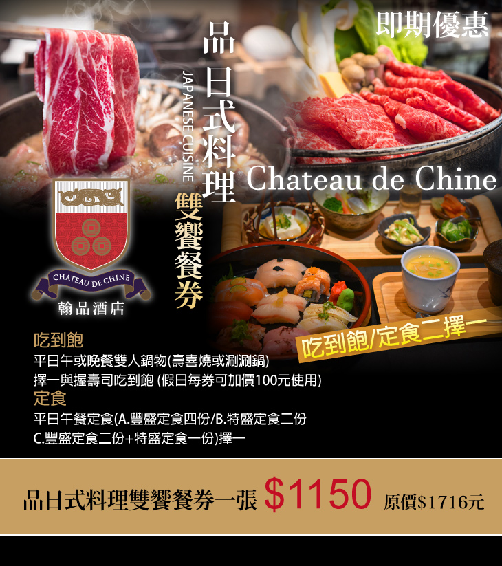 (1)平日午或晚餐雙人鍋物(壽喜燒或涮涮鍋)擇一與握壽司吃到飽、(2)平日午餐定食(A.豐盛定食四份/B.特盛定食二份/C.豐盛定食二份+特盛定食一份)擇一(假日每券可加價100元使用)