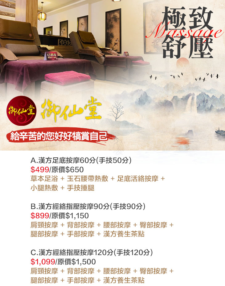 御仙堂為御手國醫之子企業,同以「源自中醫,專注養生」為理念,訴求極致的個人養生享受,並以亞健康調理為服務主軸。以中式古典風格為基調,並將人文、藝術、休閒概念集於一身,讓您如來到神秘佳境,提供漢方經絡指壓、油壓鬆筋等按摩服務,同時傳遞養生概念,讓您卸下一身的疲憊,沉浸在健康又舒適的療程中,重獲輕盈的體態與步伐。