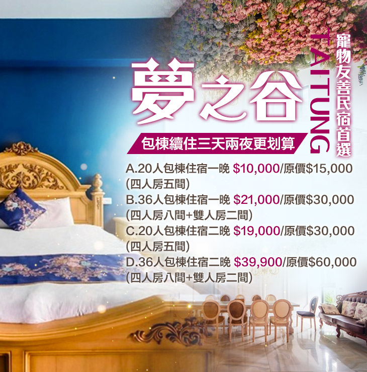 來到了台東市郊綠色隧道旁的夢之谷民宿,彷彿一腳踏進了童話中的愛麗絲夢遊仙境!以大量的花牆擺設迎接了旅人們的到來。在這裡手機、相機通通停不下來,打卡、攝影,讓網美們也無法抵擋;不僅是帶來夢幻美麗的氛圍,也要給您舒適放鬆的感受!民宿更是熱氣球高台、初鹿牧場、知本遊樂森林、史前博物館等熱門景點的中間點,讓您能輕鬆遊覽各地!