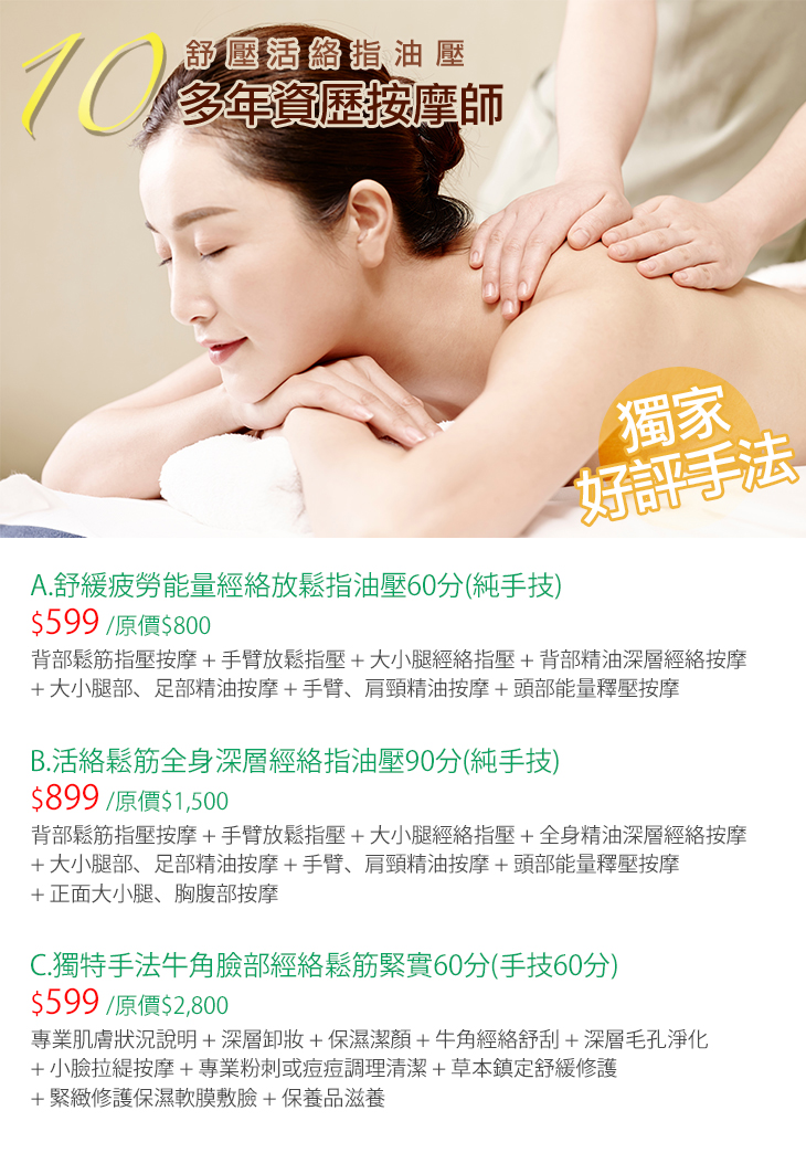 A.舒緩疲勞能量經絡放鬆指油壓60分(純手技) / B.活絡鬆筋全身深層經絡指油壓90分(純手技) / C.獨特手法牛角臉部經絡鬆筋緊實60分(手技60分)
