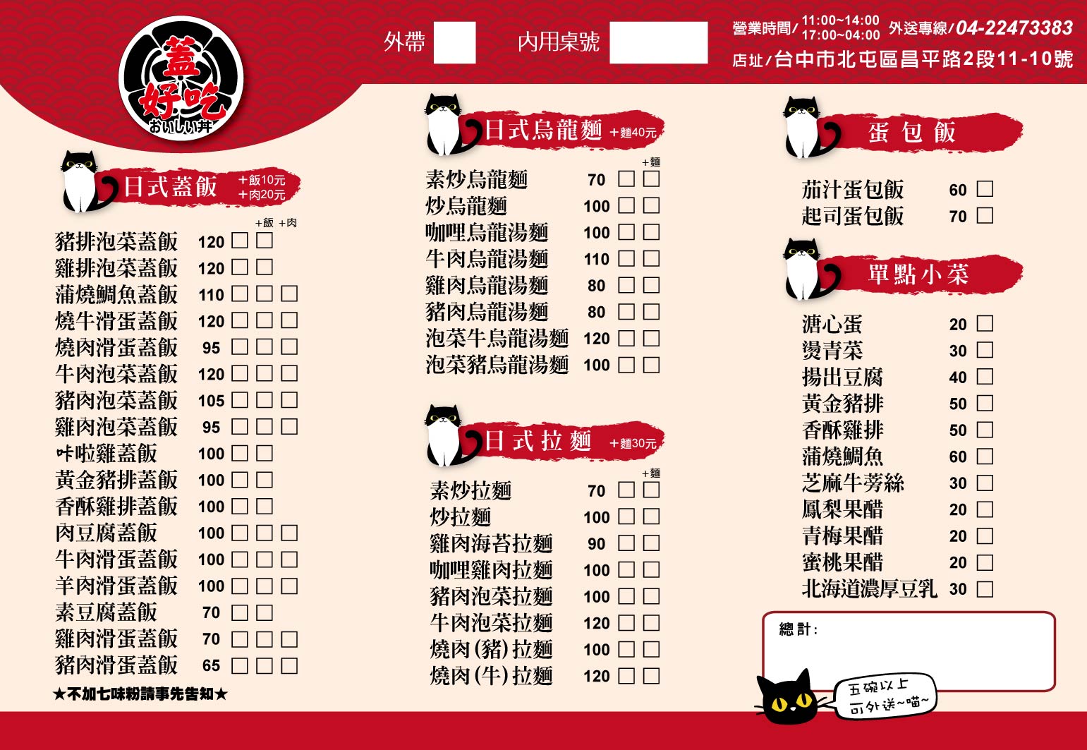 夜貓首選!店家堅持選用當季新鮮食材,秉持著現點現做的職人精神,致力於烹調出一道道色香味俱全的餐點,呈現您記憶中那最平凡樸實、卻又耐人尋味的媽媽味,這裡提供的品項種類繁多,蓋飯、烏龍麵、拉麵等各式風味應有盡有,多樣化的選擇滿足了顧客們不同的味蕾需求,保證讓您全家大小都吃得滿意又安心,絕對值得您蒞臨造訪,細細品嚐一番。