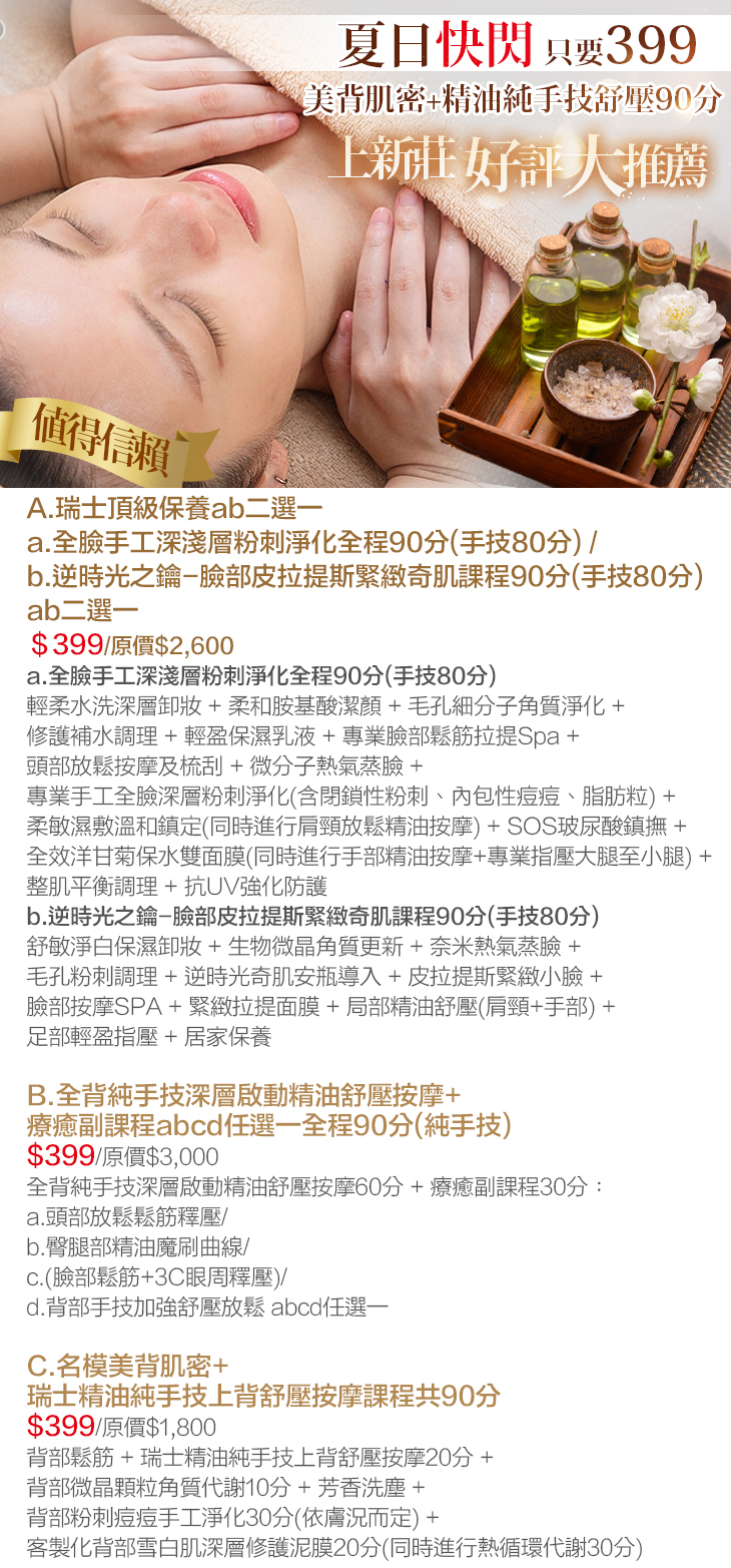 A.瑞士頂級保養ab二選一 / B.全背純手技深層啟動精油舒壓按摩+療癒副課程abcd任選一全程90分(純手技) / C.名模美背肌密+瑞士精油純手技上背舒壓按摩課程共90分