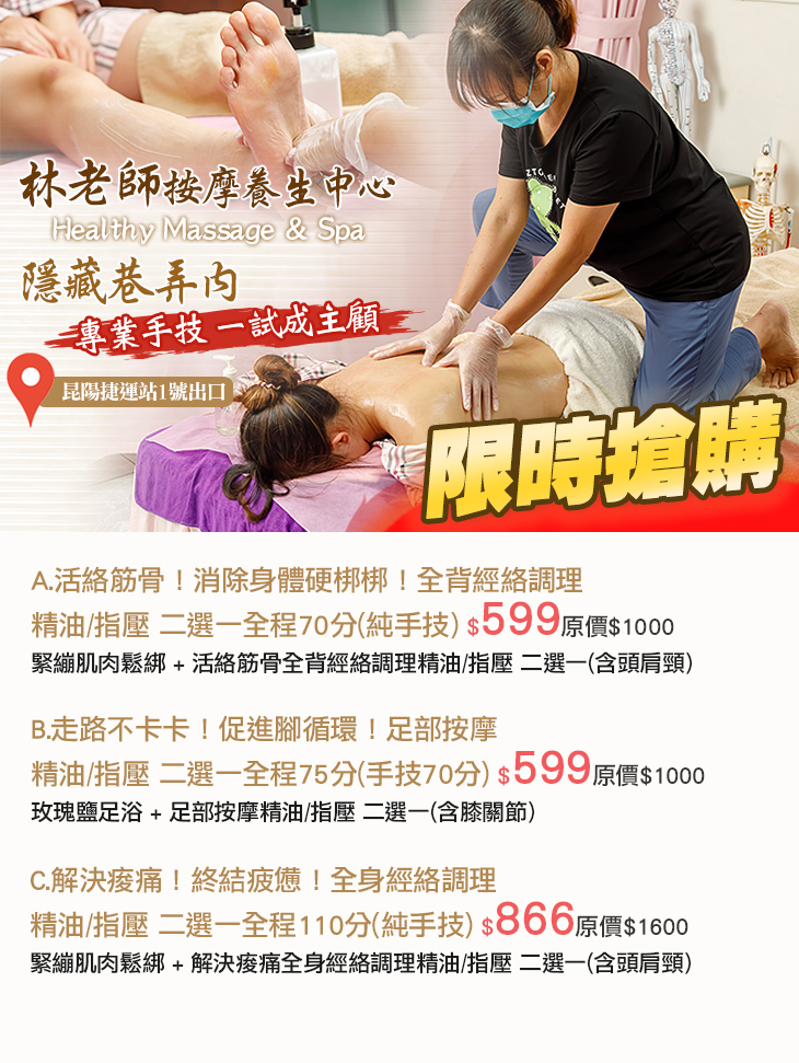 A.活絡筋骨!消除身體硬梆梆!全背經絡調理精油/指壓 二選一全程70分(純手技) / B.走路不卡卡!促進腳循環!足部按摩精油/指壓 二選一全程75分(手技70分) / C.解決痠痛!終結疲憊!全身經絡調理精油/指壓 二選一全程110分(純手技)