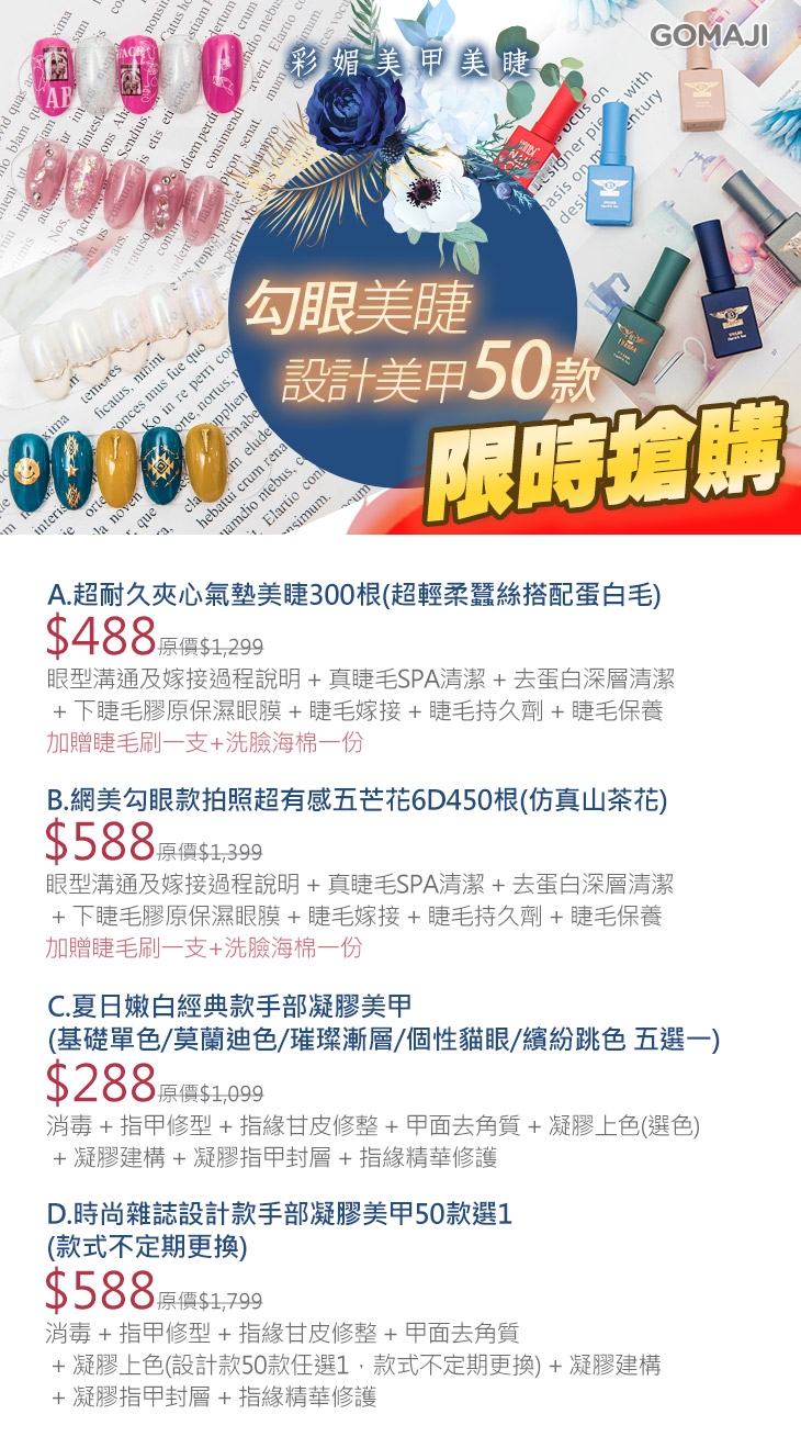 A.超耐久夾心氣墊美睫300根(超輕柔蠶絲搭配蛋白毛) / B.網美勾眼款拍照超有感五芒花6D450根(仿真山茶花) / C.夏日嫩白經典款手部凝膠美甲(基礎單色/莫蘭迪色/璀璨漸層/個性貓眼/繽紛跳色 五選一) / D.時尚雜誌設計款手部凝膠美甲50款選1(款式不定期更換)