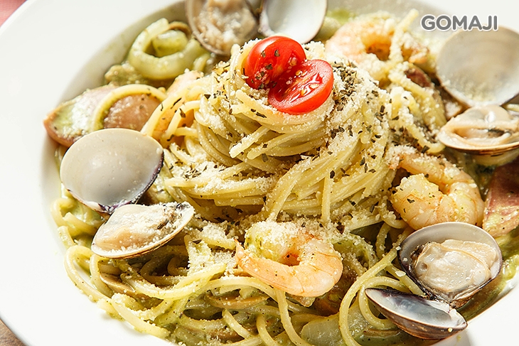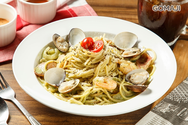 呈現嫩綠色澤的青醬與彈牙義大利麵交織出美妙口感,透著迷人的香氣,配上肥美蛤蠣、鮮蝦等豐盛配料,濕潤溫潤、醇香味美,如海浪般不停拍打著舌尖,海島風味十足!