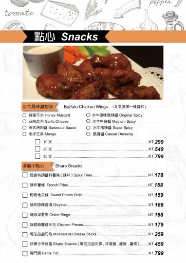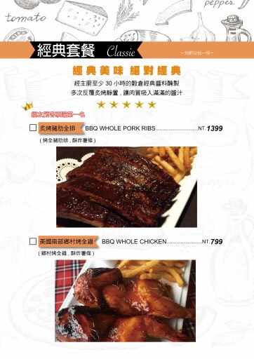 美式餐廳中的經典菜色!以獨家料理手法讓肉質自然入味,從外皮的煙燻色澤到內層滑嫩不油膩的豬肋排,散發一股淡淡的煙燻香氣,外裹唇齒留香的BBQ醬汁一同入口,味蕾再也招架不住,忍不住豪邁地大口咬下,香熱肉汁瞬間流洩而出,舌尖上充斥著豬肋排的濃、醇、香,給您回味再三的味蕾享受!