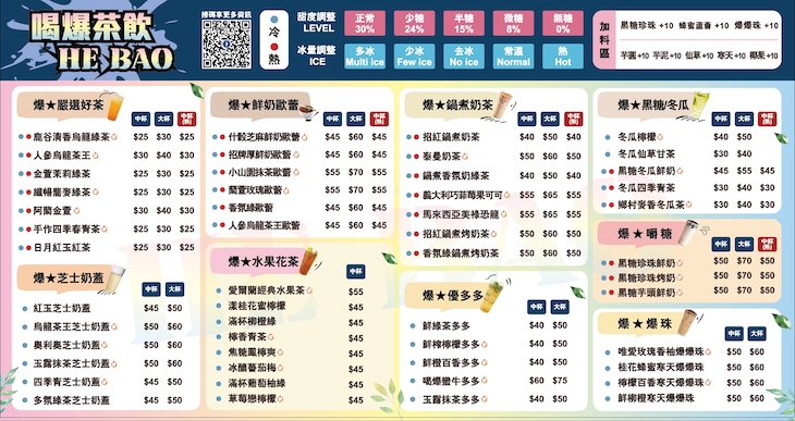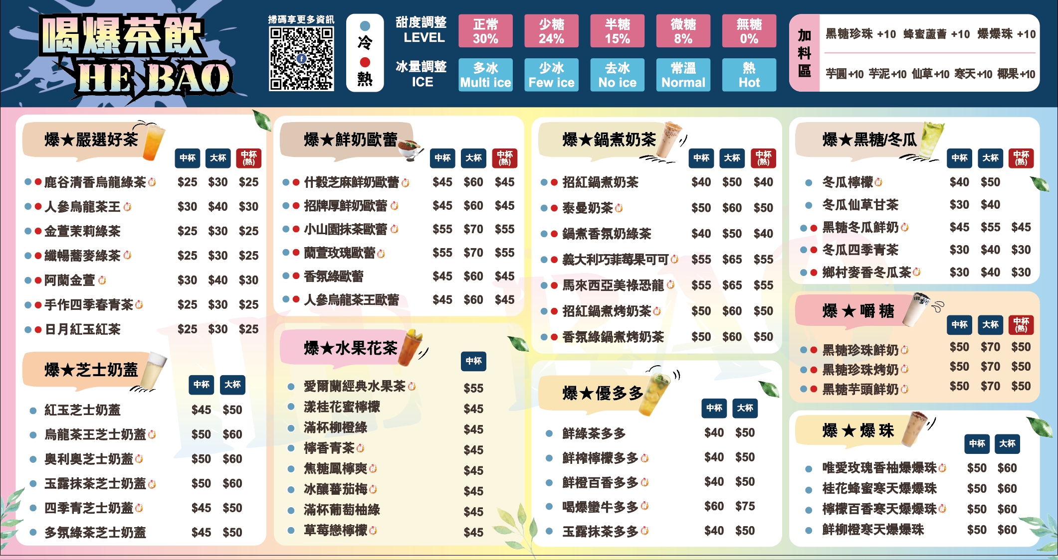 【喝爆茶飲】揀選品質上等的茶葉,搭配來自優質乳源的鮮奶及原料,調製出一杯又一杯喝得到茶香純粹的手搖茶飲~忠於原味呈現的理念,不添加多餘的調味,不僅展現天然茶韻,也將素材發揮得淋漓盡致。
