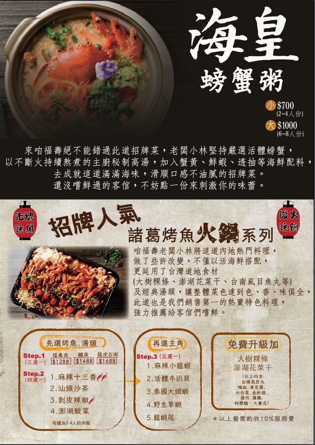 【福壽海鮮料理】選用活海鮮為主打,延續中式台菜傳統料理手法,帶入新意巧思的擺盤呈現。因台灣國土曾被日本統治了50年之久,生活文化至今早已無法切割,此風更是長者懷舊的意境,故想營造出中日現代風格的用餐環境,又因創始人個性幽默風趣且又有沉穩的一面,所以店內的裝潢風格才有了兩種體面的呈現!