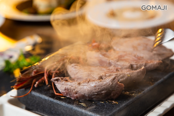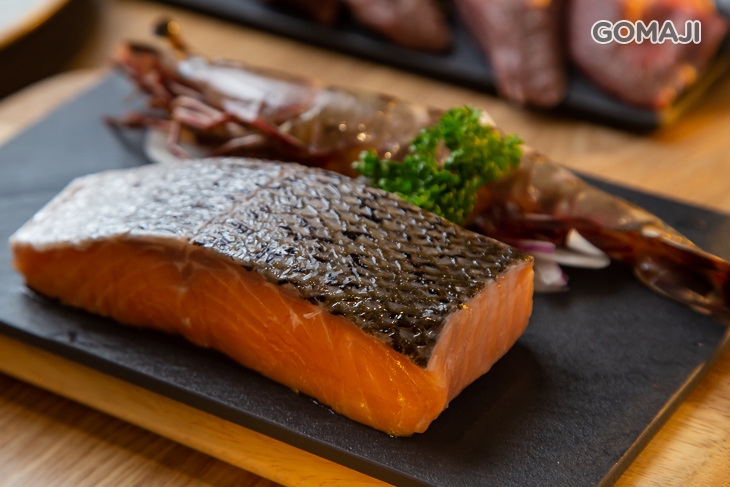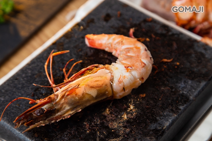 嚴選深海挪威鮭魚,飽滿紮實的肉塊,擁有勻稱美麗的油花分布與光滑軟Q的外皮,在岩石上翻煎料理,鮮味陣陣撲鼻,肉質甘甜,口感細緻,與手掌蝦相襯,帶您享有最奢華的海鮮佳餚饗宴。