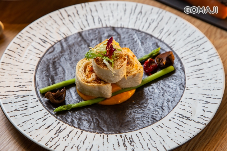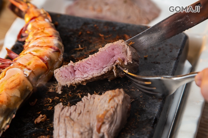 將精心挑選的美國牛肩菲力與野生海捕手掌蝦相組,完美獻上,焦糖般的肉質色澤,擁有粉嫩鮮美的肉質,刀叉切下,香氣瞬間撲鼻,取塊品嚐,肉汁與油汁在嘴裡交緻,那專屬魅力讓眾人無法抗拒,配上甘甜彈牙的蝦子,堪稱無敵,錯過可惜。