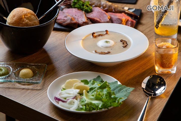 - - 歐式小圓麵包 + 生菜搭肉組 + 烏梅醋 + 牛肝菌菇奶油濃湯 - -