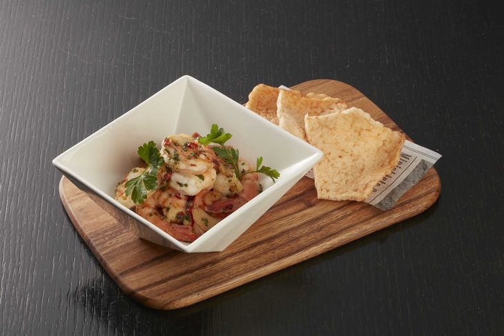 選用肉質紮實、彈牙的上等鮮蝦料理,運用香蒜、辣椒等開胃的辛香佐料入味,讓蝦肉原有的甘甜,在蒜的辛與辣椒的香之中,顯得鮮甜更勝!這道精緻用心的小品,味濃鮮美、涮嘴誘人~配上一杯特調雞尾酒品嚐,別緻享受,令人難忘。