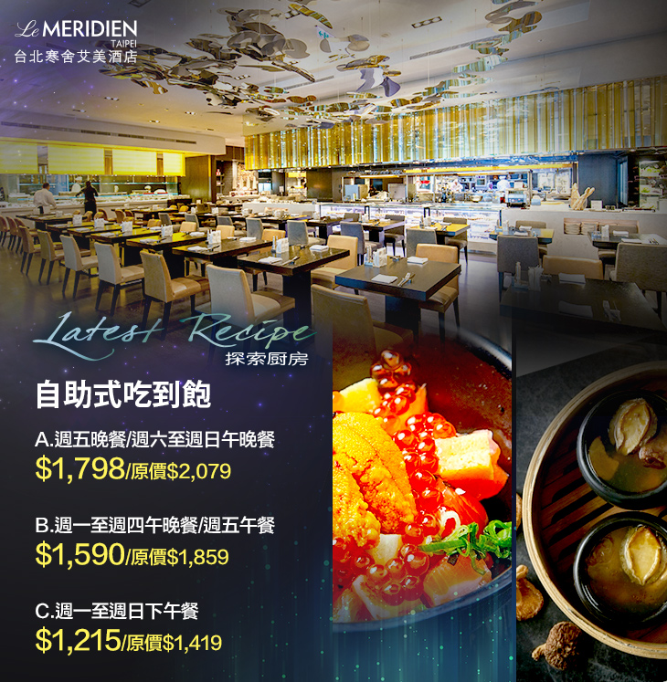 採用開放式自助餐檯與單點兼具的新潮用餐方式,菜樣豐富,從前菜的沙拉,到主食的爐烤比薩、現煎牛排,以及餐後甜點等,都是主廚團隊富滿巧思的創意美味。同時,為了控管食物品質,更隨時更替菜色,僅選用當季最新鮮、肥美的食材料理,看那專業的廚師團隊在您眼前俐落地烹調著每一道餐,令人驚豔的手藝,看得著迷不已!探索廚房,讓品嚐美食成為一種華麗的感官饗宴,開啟自助餐的全新視野!