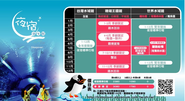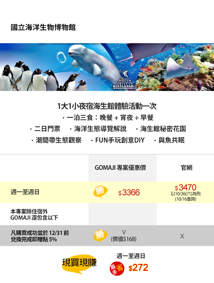 ➤ GOMAJI獨家:1大(6歲以上)1小(3歲以上-未滿6歲)夜宿海生館,絕對超值!