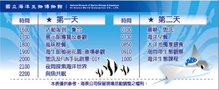 夜宿海生館活動為兩天一夜的生態體驗遊程,全程包括了海生館兩日入館參觀體驗、六項夜宿海生館體驗遊程、餐食服務將提供當天晚餐、宵夜、次日早餐,以及依所選場域與海洋生物共眠。