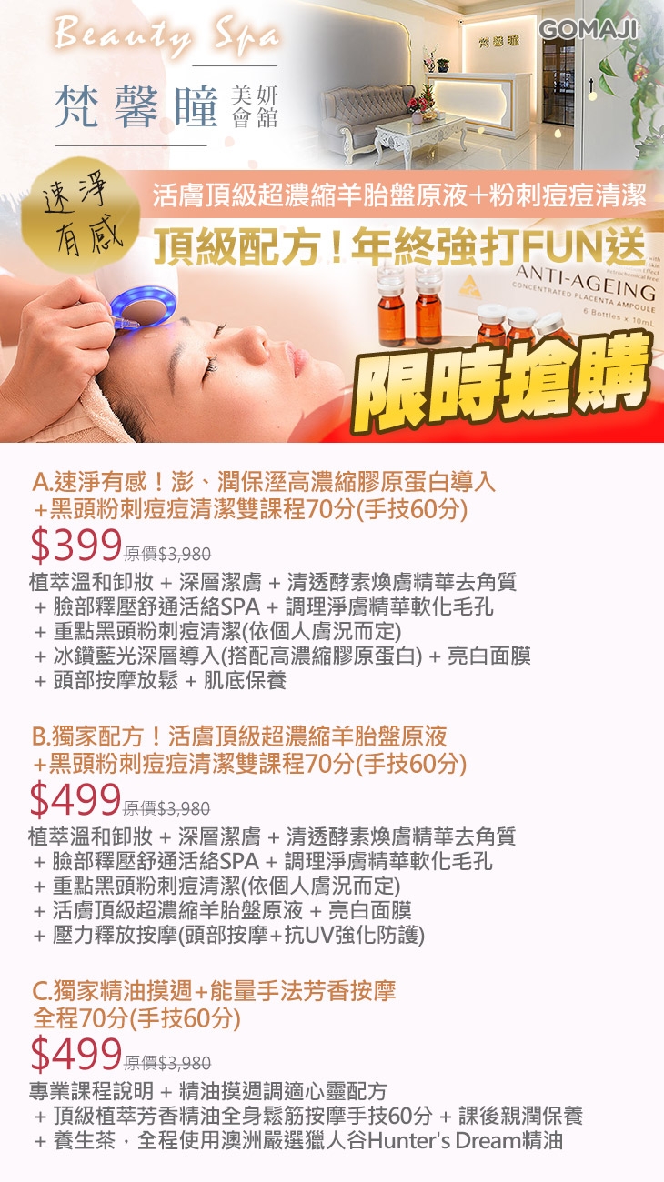 A.速淨有感!澎、潤保溼高濃縮膠原蛋白導入+黑頭粉刺痘痘清潔雙課程70分(手技60分) / B.獨家配方!活膚頂級超濃縮羊胎盤原液+黑頭粉刺痘痘清潔雙課程70分(手技60分) / C.獨家精油摸週+能量手法芳香按摩全程70分(手技60分)