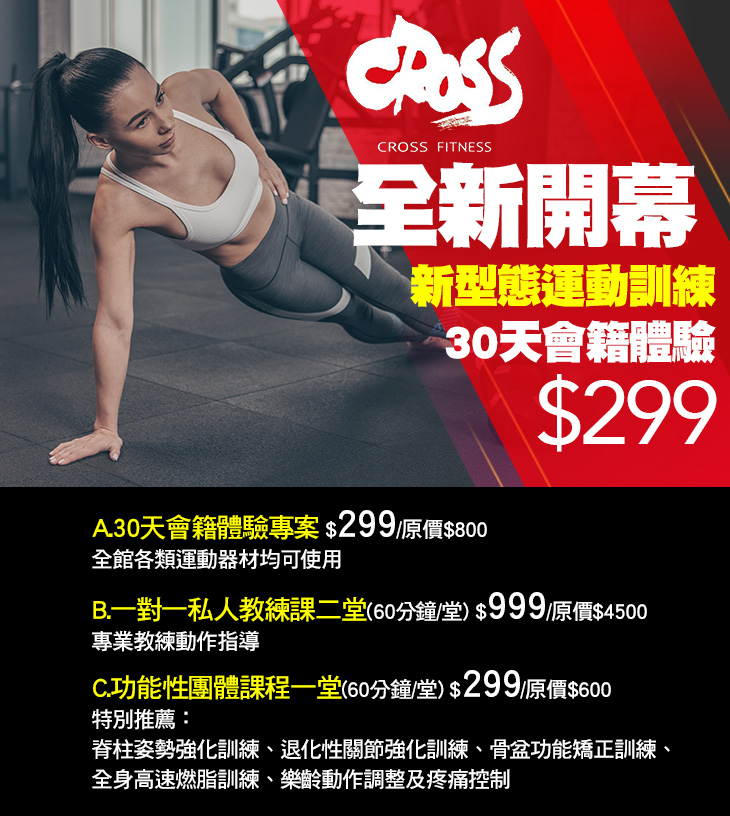 A.30天會籍體驗專案 / B.一對一私人教練課二堂(60分鐘/堂) / C.功能性團體課程一堂(60分鐘/堂)