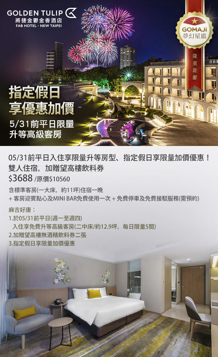 ★ 5/31前平日(週一至週四)入住享限量升等高級客房(二中床),每房招待兩位未滿6歲免費入住。