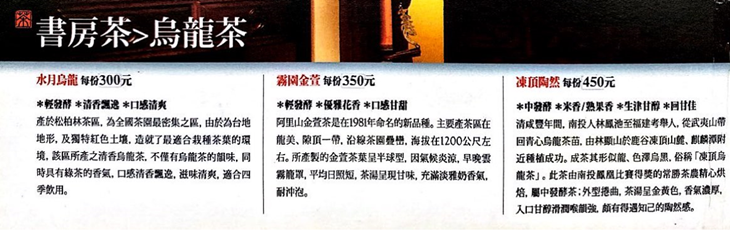 上選優質品種烏龍茶,以適當的熱水溫度新鮮沖泡而成。如黃色水晶般剔透的茶湯色澤,在玻璃杯裡,因為燈光的穿透,顯得更耀眼、閃亮。品嚐前,先細聞茶葉的淡香,感受烏龍茶獨特的茶香,單點一杯再加份點心享用,無論是核桃椰棗鑲還是春曉綠豆糕,不同組合皆帶給您難以忘記的驚喜感喔!.jpg)