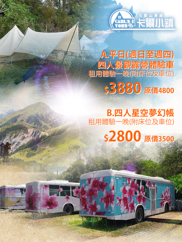 ➴A. 平日(週日至週四)四人景觀露營體驗車租用體驗一晚(附床位及車位)