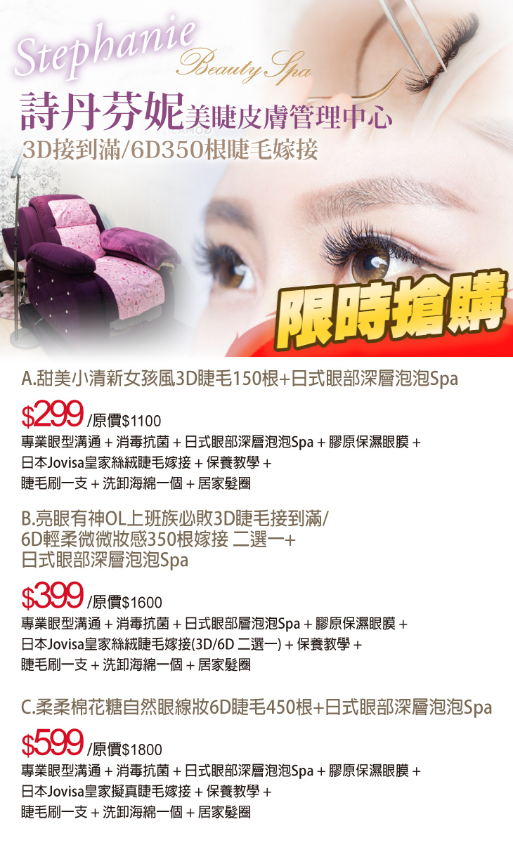 A.甜美小清新女孩風3D睫毛150根+日式眼部深層泡泡Spa / B.亮眼有神OL上班族必敗3D睫毛接到滿/6D輕柔微微妝感350根嫁接 二選一+日式眼部深層泡泡Spa / C.柔柔棉花糖自然眼線妝6D睫毛450根+日式眼部深層泡泡Spa