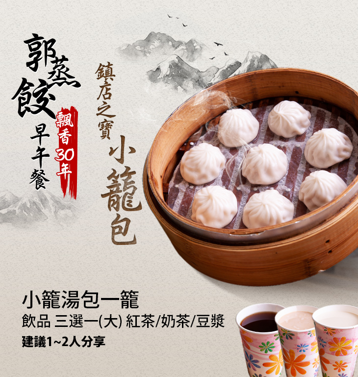 〈小籠湯包一籠 + 紅茶(大)/奶茶(大)/豆漿(大) 三選一〉建議1~2人分享
