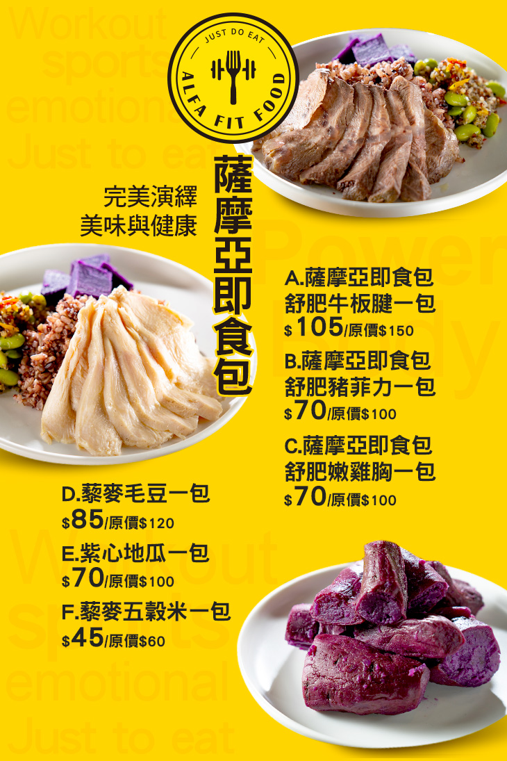 A.薩摩亞即食包-舒肥牛板腱一包 / B.薩摩亞即食包-舒肥豬菲力一包 / C.薩摩亞即食包-舒肥嫩雞胸一包 / D.藜麥毛豆一包 / E.紫心地瓜一包 / F.藜麥五穀米一包