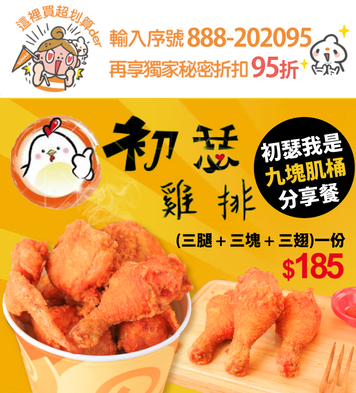 「太好吃了!真是相見恨晚!」凡是首嚐【初瑟雞排】的人,都會忍不住這麼想。那脆嫩多汁的鹹香炸雞、金黃酥香的炸物小點,熱騰騰地擺在眼前,誘人香氣迎面而來,叫人怎麼能不垂涎三尺呢?其實,品嚐美味現在還不算太晚,現在就手刀下單【初瑟雞排】與GOMAJI聯手帶來的超值優惠方案,將滿滿豐盛的九塊雞桶帶回家,與家人們一同分享吃雞的喜悅吧!