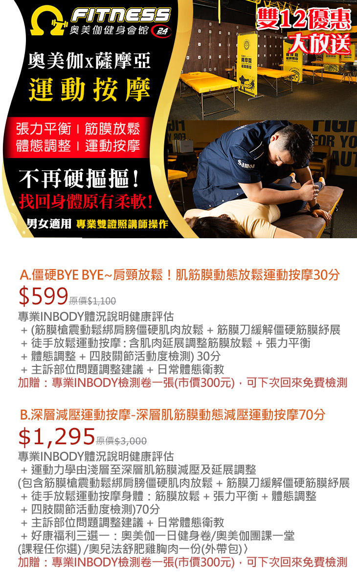 〈專業INBODY體況說明健康評估 + 運動力學由淺層至深層肌筋膜減壓及延展調整(包含筋膜槍震動鬆綁肩膀僵硬肌肉放鬆+筋膜刀緩解僵硬筋膜紓展+徒手放鬆運動按摩身體:筋膜放鬆+張力平衡+體態調整+四肢關節活動度檢測)70分 + 主訴部位問題調整建議 + 日常體態衛教 + 好康福利三選一:奧美伽一日健身卷/奧美伽團課一堂(課程任你選) /奧兒法舒肥雞胸肉一份(外帶包)〉加贈:專業INBODY檢測卷一張(市價300元),可下次回來免費檢測