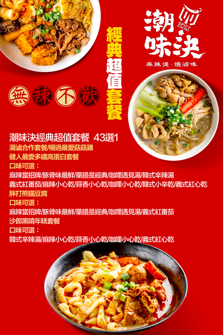 隨著時代的變化與演進、人們飲食習慣的改變,獨食族、快食族已成普遍!要滿足口味多變、東挑西選又想吃飽的麻吉,唯獨滷味能夠大大滿足您我這份渴望的心!超乎想像的滷味新品種 - 【潮味決-麻辣燙‧燒滷味】哈燒登場!以獨門的醬料結合『四川麻辣乾鍋』工法,創造出獨一無二的『燒滷味』,讓『麻辣燙、燒滷味』有湯吃、乾吃多種不同的口味變化!改變您對滷味的想法,透過味蕾去用心體會【潮味決-麻辣燙‧燒滷味】那最獨一無二的品牌特色!