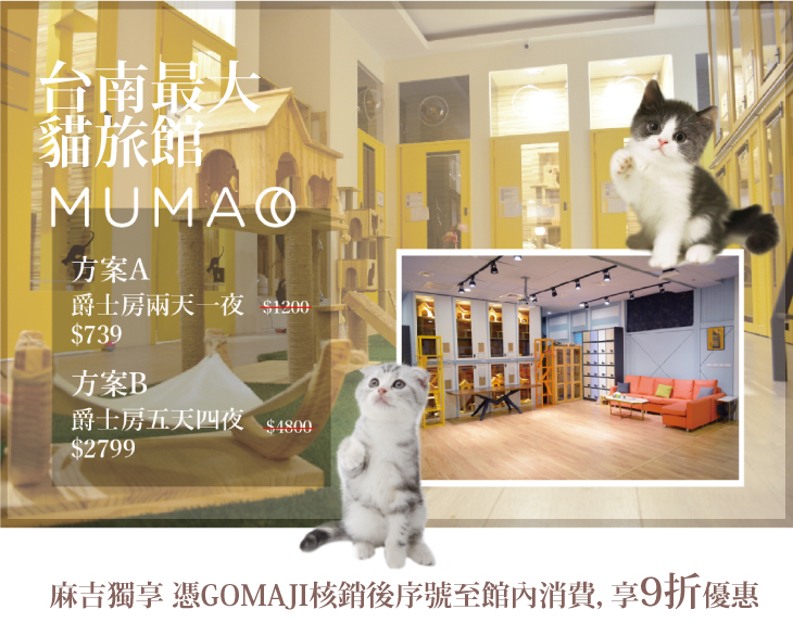 面對即將到來的公務出差、出國旅行、出遠門,擔心家裡那隻貓寶貝,該住哪好?誰能幫忙照顧?這樣的情況,您是否曾經也有過呢!來來來,別擔心!GOMAJI最大吃喝玩樂平台為各位精選直擊位於台南東區裕農路上,為台南最大、最讚、最優質的寵物旅館 - 【牧貓精品寵物旅館】,提供乾淨舒適的住宿環境,完善齊全的設施設備,熱忱周到的服務與美容,讓貓孩們可以放心、自在、無打擾的安心入住!獨立抽風設備、離子循環活水機、遊戲跳台空間、木製隱密貓窩、貓專屬設計碗架、陶瓷食用碗、加大舒適貓砂盆、方便貓通道,該有的一定都有,有的也一定都提供!本次更推出麻吉獨享優惠,心動不如馬上行動!