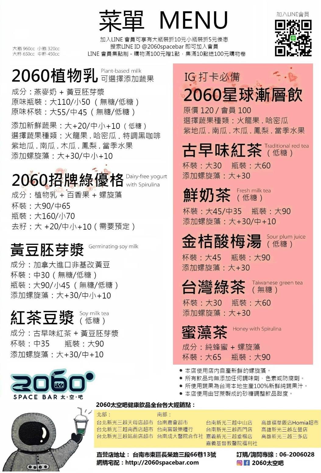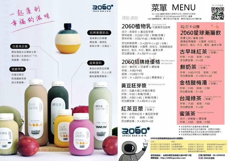 以外太空的奇幻為主軸,新穎造型、具有巧思的店內佈置與特製商品,都帶給您滿滿驚喜!2060太空吧的健康系飲品,替您找到方便又天然的營養品!採用新鮮的螺旋藻並加入多種食材,搭配精細的比例調配,不僅營養價值高又好喝!獨特的好滋味,邀您來一同嚐鮮、品美味!