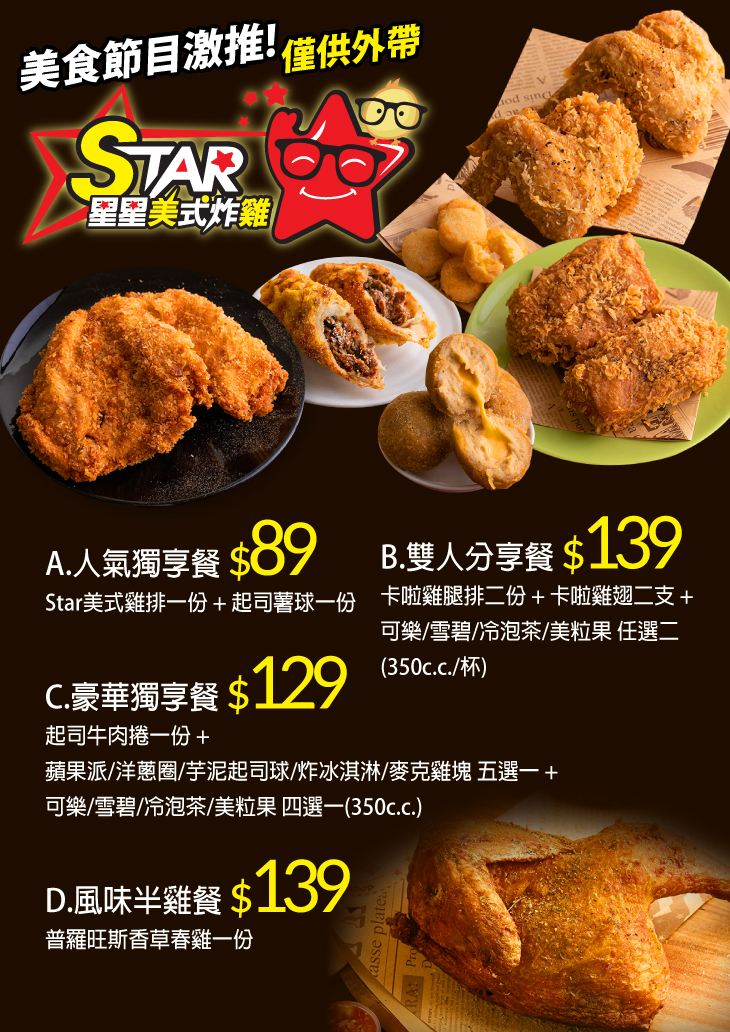本店經典招牌 - Star美式雞排!擁有巨星般光芒的美式雞排,以溫體雞肉來料理,酥脆外皮,一口咬下,清脆悅耳的聲音讓人著迷,大口品嚐,肉質紮實、飽滿,鮮嫩又JUICY ~ 精心挑選的食材,用心製作的料理,用超值優惠為您獻上,也太物超所值了吧!