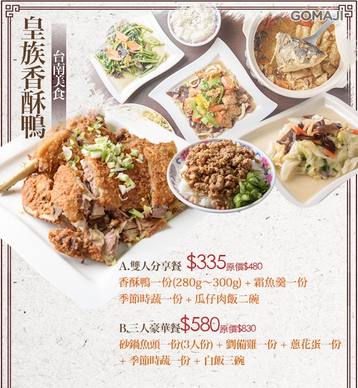 來一趟美食之都台南,別說您沒吃過〝皇族〞!鄰近水萍塭公園、中西區金華路三段上!他們以香酥鴨聞名,其他四川回鍋鴨、廣西檸檬鴨、芋泥鴨都各有特色,誰說吃川味料理一定得非出國、跑餐廳?具有中國川式家常菜⋯⋯等傳統特色功夫菜佳餚聞名的【皇族香酥鴨】,有簡約、乾淨的空間環境,可帶給顧客舒適、自在的用餐心情。嚴選食材、每日新鮮備料,搭配店家多年來研發、累積的經驗好手藝,成功用專屬美味,打動饕客的心!午、晚餐,總是那幾間再輪替、來到台南玩也只有固定去那幾間用餐嗎?本此與GOMAJI聯合釋出超值優惠,機會難得,請加緊把握!錯過就沒有囉!