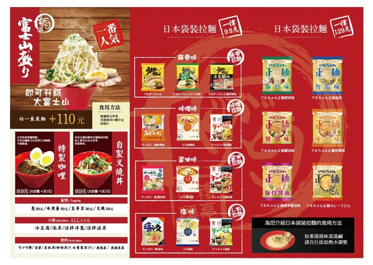 投入用心與堅持,汲取食材中的養份與精華,完美造就出這碗人人稱讚的富士山拉麵,以滿滿的豆芽菜與叉燒肉片組合而成,在日本成為二郎系拉麵。一口拉麵、一口配料,讓人吃得唇齒留香,整個超滿足!