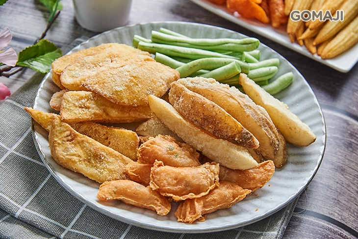 帶 皮 馬 鈴 薯、薯 條、四 季 豆、月 亮 蝦 餅