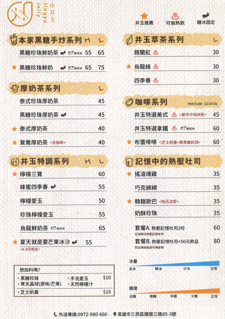 餐點提供以創意特調飲品為主,口味豐富多元,有黑糖手炒系列、厚奶茶系列到井玉萃茶系列等,不同基底的茶與不同風味的配料,依照適當的冰塊與甜度調配製成,讓飲品美味,除了止渴解熱,品嚐過程中更添增了些趣味。無飲不歡的麻吉,這間趕緊收入口袋名單中,揪伴前往買一波!
