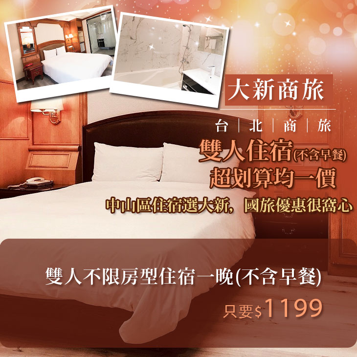 不分平假日!麻吉獨享優惠報給您知!位於台北市中山區長春路246號上的【大新商旅】,在車水馬龍、人聲鼎沸的台北市中心,提供旅人安靜、舒適的住宿環境!簡約、典雅不失時尚的空間設計,提供全方位商旅設備及專業級的待客服務,讓您即便遠離他鄉,來到此地,旅遊放鬆休息、商務洽公,都能帶給您不同以往,既美好又愉悅的休歇、住宿印象與回憶!