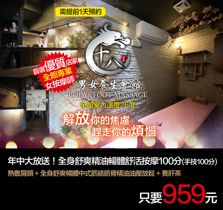 十八男女養生會館環境乾淨、價格優惠、高素質男女頂級舒壓服務!