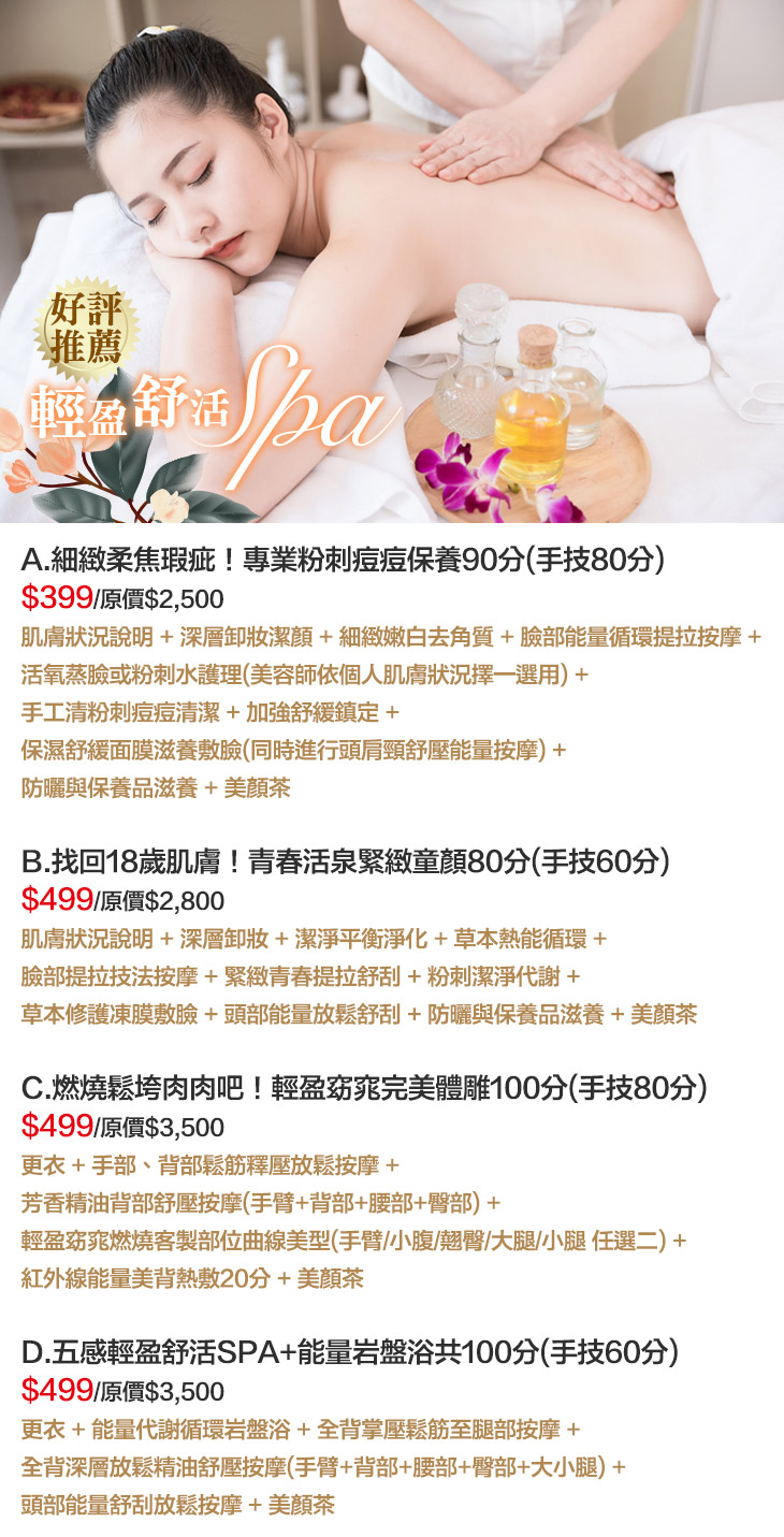 A.細緻柔焦瑕疵!專業粉刺痘痘保養90分(手技80分) / B.找回18歲肌膚!青春活泉緊緻童顏80分(手技60分) / C.燃燒鬆垮肉肉吧!輕盈窈窕完美體雕100分(手技80分) / D.五感輕盈舒活SPA+能量岩盤浴共100分(手技60分)