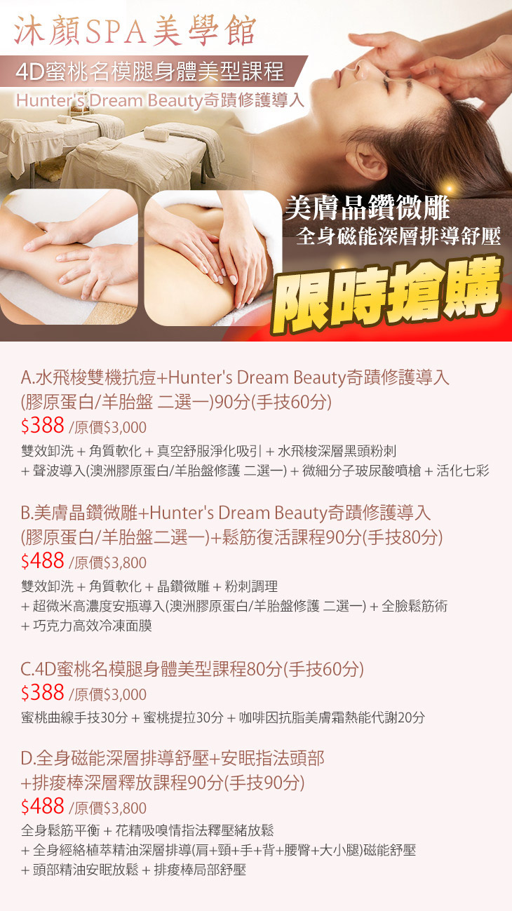 A.水飛梭雙機抗痘+Hunter's Dream Beauty奇蹟修護導入(膠原蛋白/羊胎盤 二選一)90分(手技60分) / B.美膚晶鑽微雕+Hunter's Dream Beauty奇蹟修護導入(膠原蛋白/羊胎盤二選一)+鬆筋復活課程90分(手技80分) / C.4D蜜桃名模腿身體美型課程80分(手技60分) / D.全身磁能深層排導舒壓+安眠指法頭部+排痠棒深層釋放課程90分(手技90分)