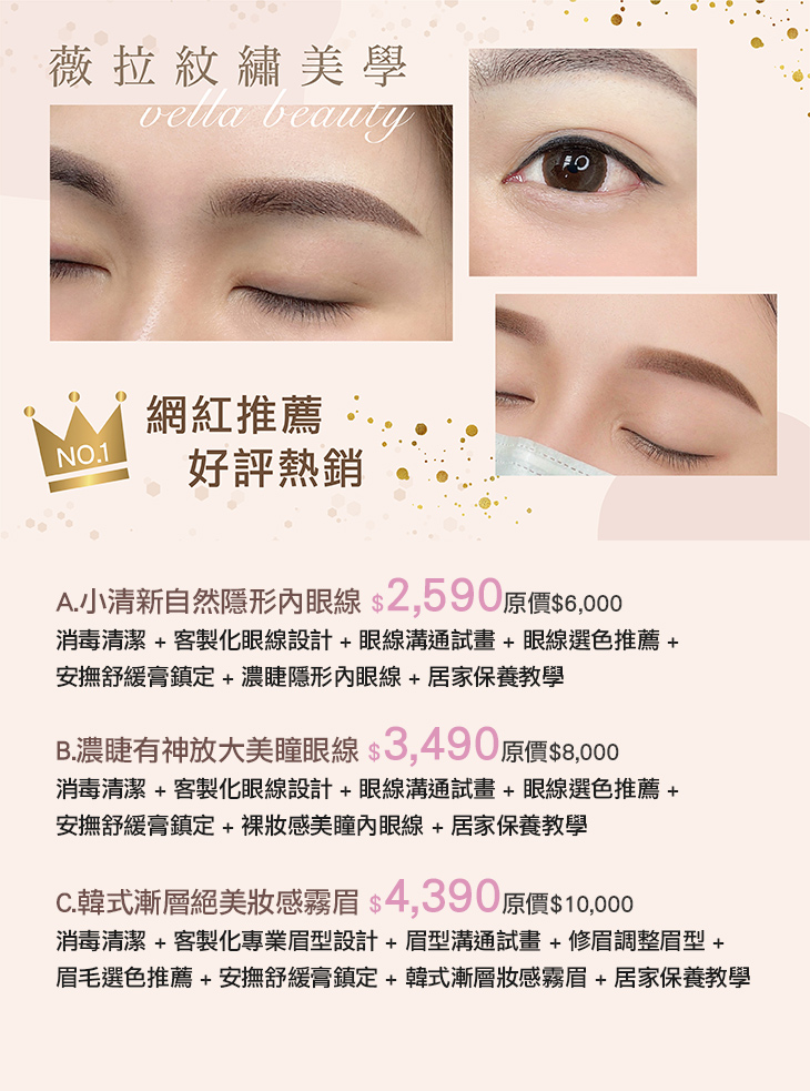 拯救無眉道人,不用再為眉毛畫不對稱困擾了!薇拉紋繡師專業的眉型設計,運用五點黃金定位法,依據你臉型的黃金比例,找出最適合你的眉型,獨特的上色手法,不適感低且不死板,一做完就非常的自然,不用擔心會有蠟筆小新的窘境,參加聚餐約會都沒有問題!